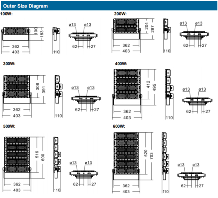 ایده آل برای روشنایی چشم انداز، تونل ها، زمین های ورزشی (فوتبالی، تنیس، بیس بال، بسکتبال) ، روشنایی دیوار بیرونی، ساختمان ها، استادیوم ها، میدان ها، پارکینگ ها، کارخانه ها و بنادر.